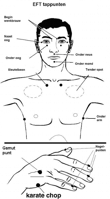 Ik vertel haar dat ik haar kan helpen met EFT. Ik leg kort uit dat we gaan wrijven en met de vingers kloppen op acupunctuurpunten. Ik doe het voor bij mezelf en het is de bedoeling dat ze dit nadoet bij zichzelf. Ik vraag haar om over het bovenste gedeelte van haar borstkas te wrijven, hier aangeduid als tender spot in de illustratie hieronder. Ik doe het voor, ze spiegelt me.